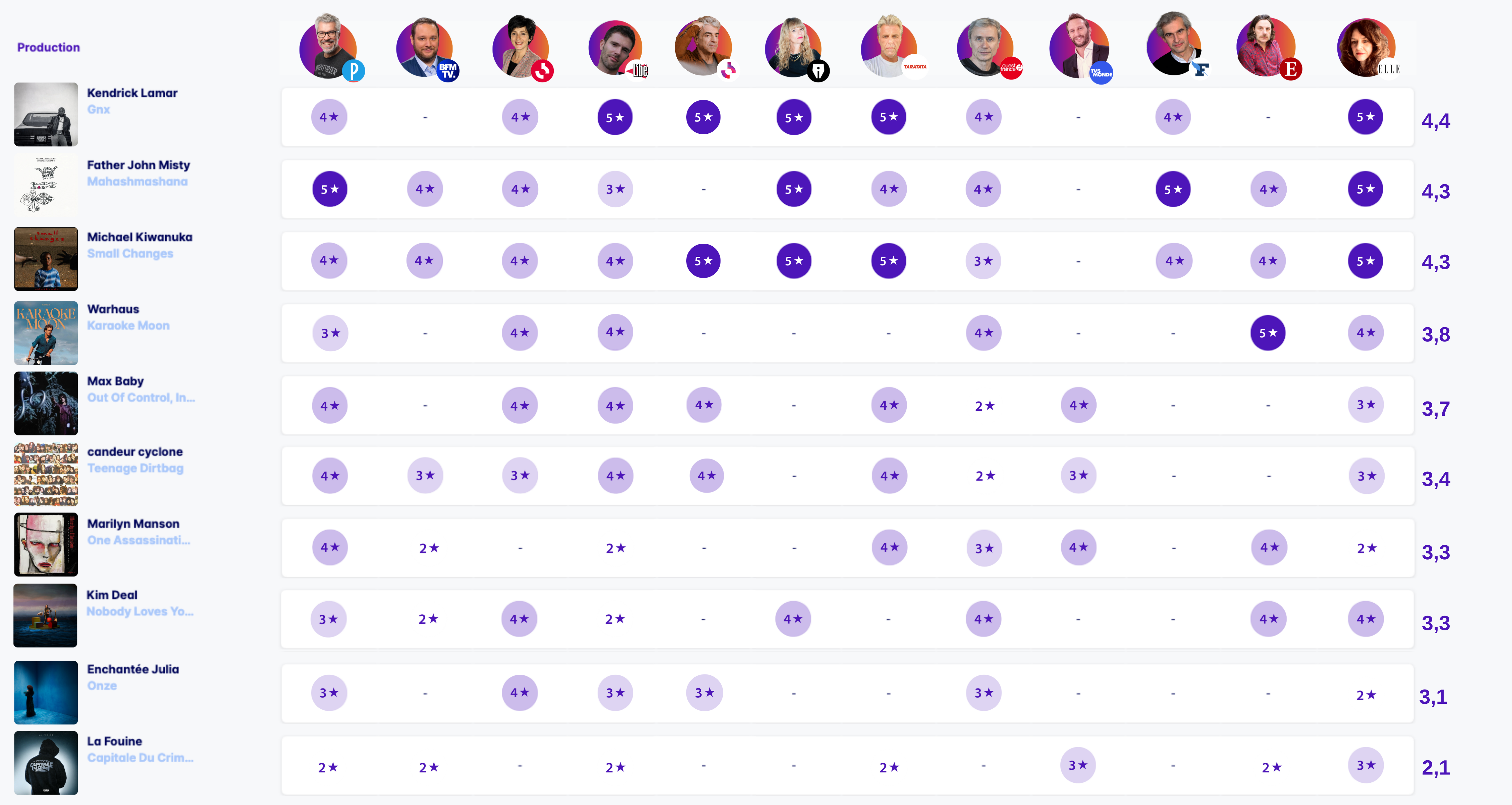 They gave their opinions: Eric Bureau (Le Parisien), Sophie Rosemont (Les Inrocks / Rolling Stone), Philippe Dufreigne (BFM TV), Didier Varrod (Radio France), Michel Troadec (Ouest France), Patrice Demailly (Libération), Emmanuel Virot (Taratata), Marion Guilbaud (France Inter), Olivier Nuc (Le Figaro), Nicolas Georges (TV5 Monde), Christian Eudeline (Les Echos) and for the first time Florence Trédez (ELLE)!