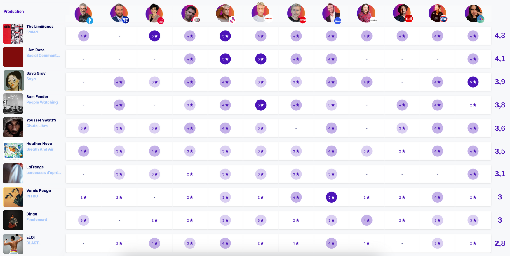Ils ont donné leurs avis : Eric Bureau (Le Parisien), Pauline Grancier (RFM), Marine Long-Paolacci (Basique), Philippe Dufreigne (BFM TV), Didier Varrod (Radio France), Michel Troadec (Ouest France), Patrice Demailly (Libération), Emmanuel Virot (Taratata), Marion Guilbaud (France Inter), Nicolas Georges (TV5 Monde), Christian Eudeline (Les Echos), Benjamin Locoge (Paris Match)!