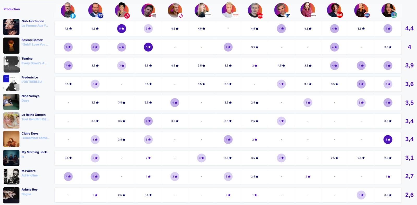 Ils ont donné leurs avis : Eric Bureau (Le Parisien), Marine Long-Paolacci (Basique), Philippe Dufreigne (BFM TV), Didier Varrod (Radio France), Michel Troadec (Ouest France), Olivier Nuc (Le Firago), Patrice Demailly (Libération), Emmanuel Virot (Taratata), Marion Guilbaud (France Inter), Nicolas Georges (TV5 Monde), Christian Eudeline (Les Echos), Benjamin Locoge (Paris Match)!
