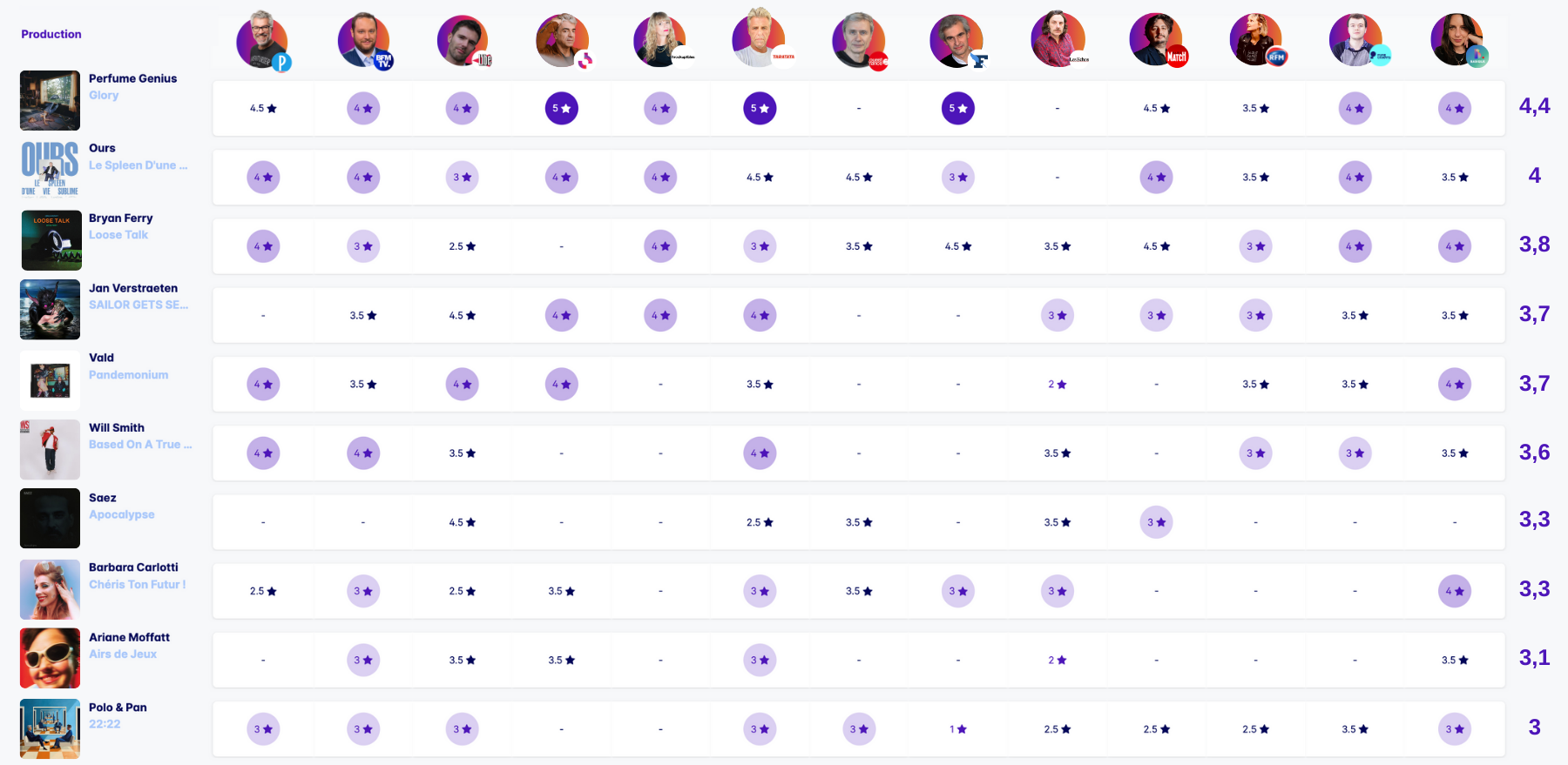 Ils ont donné leurs avis : Eric Bureau (Le Parisien), Marine Long-Paolacci (Basique), Philippe Dufreigne (BFM TV), Didier Varrod (Radio France), Michel Troadec (Ouest France), Olivier Nuc (Le Figaro), Patrice Demailly (Libération), Emmanuel Virot (Taratata), Marion Guilbaud (France Inter), Nicolas Georges (TV5 Monde), Christian Eudeline (Les Echos), Benjamin Locoge (Paris Match)!