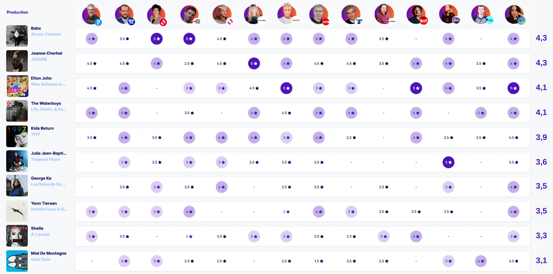 Ils ont donné leurs avis : Eric Bureau (Le Parisien), Marine Long-Paolacci (Basique), Philippe Dufreigne (BFM TV), Didier Varrod (Radio France), Michel Troadec (Ouest France), Olivier Nuc (Le Figaro), Patrice Demailly (Libération), Emmanuel Virot (Taratata), Marion Guilbaud (France Inter), Nicolas Georges (TV5 Monde), Christian Eudeline (Les Echos), Benjamin Locoge (Paris Match)!