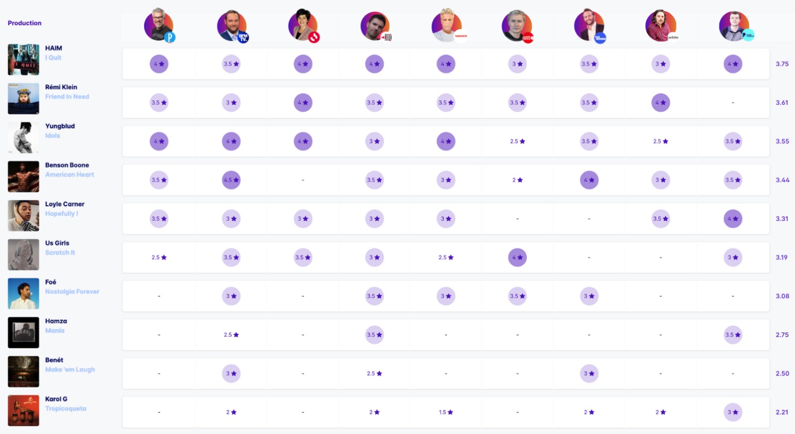 Eric Bureau (Le Parisien), Philippe Dufreigne (BFM TV), Marion Guilbaud (France Inter), Patrice Demailly (Libération), Didier Varrod (Radio France), Sophie Rosemont (Les Inrocks), Emmanuel Virot (Taratata), Michel Troadec (Ouest France), Christian Eudeline (Les Echos), Benjamin Locoge (Paris Match), Théau Berthelot (Pure Charts) et Georges Hein (S-quive) !