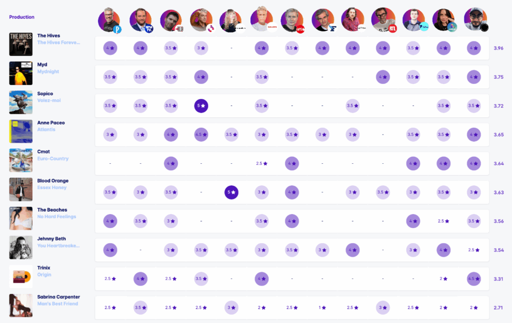 Eric Bureau (Le Parisien), Philippe Dufreigne (BFM TV), Patrice Demailly (Libération), Didier Varrod (Radio France), Sophie Rosemont (Les Inrocks), Emmanuel Virot (Taratata), Théau Berthelot (Pure Charts), Christian Eudeline (Les Echos), Eric Jean-Jean (RTL), Michel Troadec (Ouest France), Olivier Nuc (Le Figaro), Georges Hein (S-Quive) et MArine Long-Paolacci (Basique) !