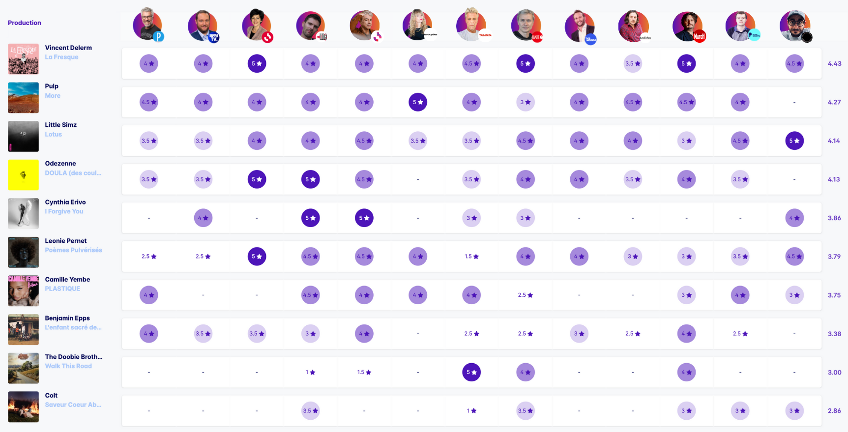 Eric Bureau (Le Parisien), Philippe Dufreigne (BFM TV), Marion Guilbaud (France Inter), Patrice Demailly (Libération), Didier Varrod (Radio France), Sophie Rosemont (Les Inrocks), Emmanuel Virot (Taratata), Michel Troadec (Ouest France), Christian Eudeline (Les Echos), Benjamin Locoge (Paris Match), Théau Berthelot (Pure Charts) et Georges Hein (S-quive) !